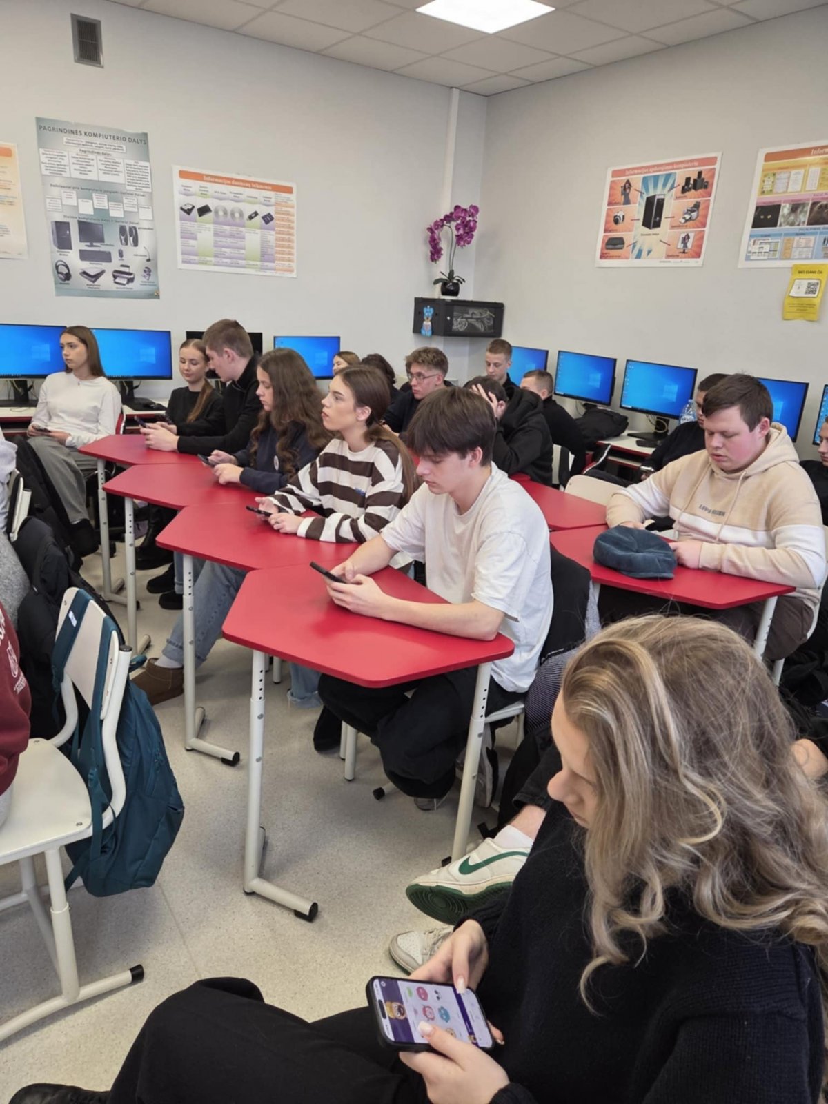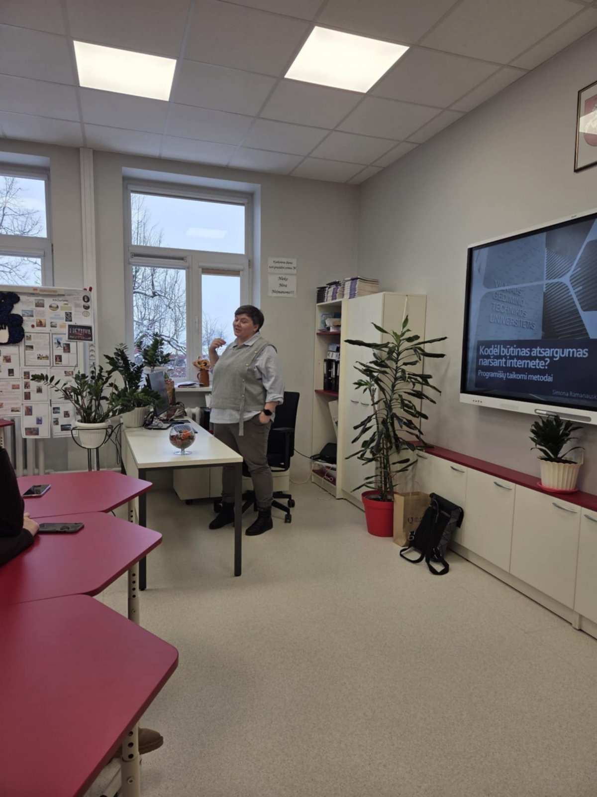 2025-11-24 mūsų gimnazijoje vyko informatikos pamoka, kurią šį kartą vedė viešnia iš VilniusTech – prof. dr. Simona Ramanauskaitė. Per dvi intensyvias ir įtraukiančias valandas profesorė pasakojo, kodėl šiandien itin svarbu elgtis atsargiai naršant internete, ir supažindino mokinius su programišių taikomais metodais.