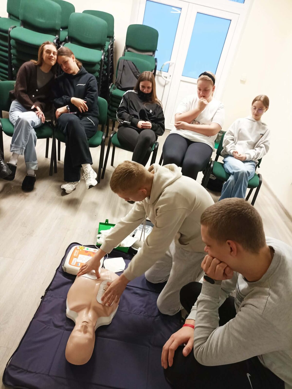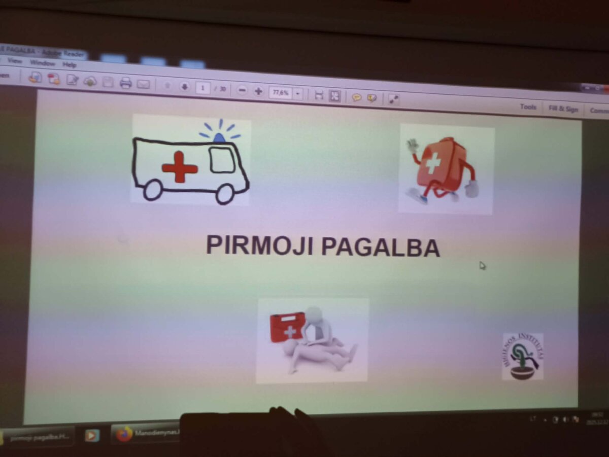 Mokymų metu mokėmės pirmosios pagalbos veiksmų esant įvairioms būklėms. Sužinojome, kaip taisyklingai sutvarstyti žaizdą, sustabdyti kraujavimą, imobilizuoti lūžus kaului, taip pat kaip atlikti dirbtinį kvėpavimą ir širdies masažą, naudojant automatinį išorinį defibriliatorių.