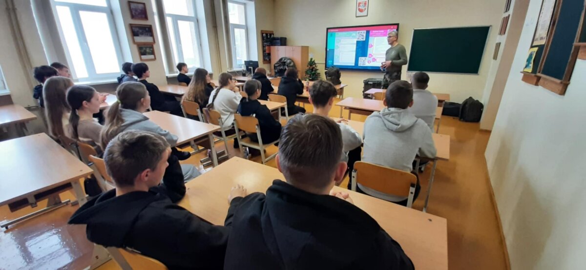 Praktinė mokymų dalis vyko ir gamtoje – mokiniai žygiavo į mišką, kur atliko įvairias praktines užduotis, stiprino komandinio darbo ir atsakomybės įgūdžius.