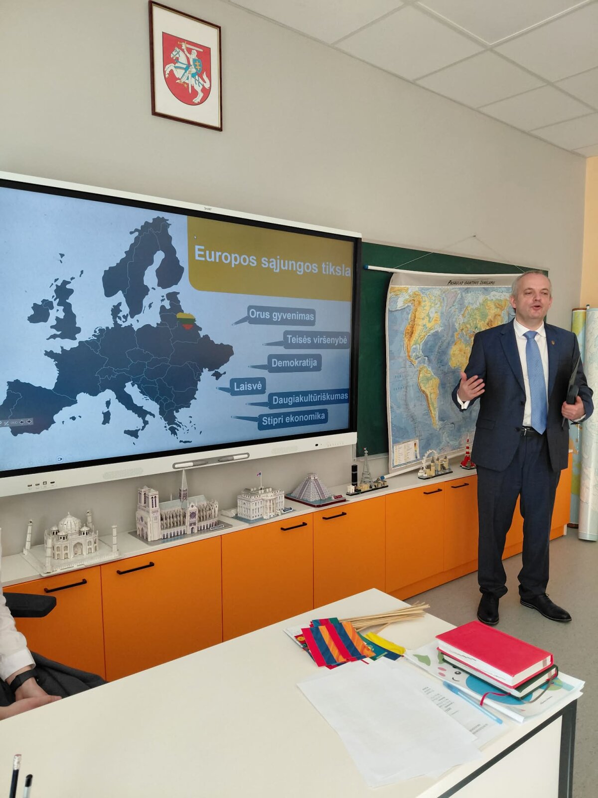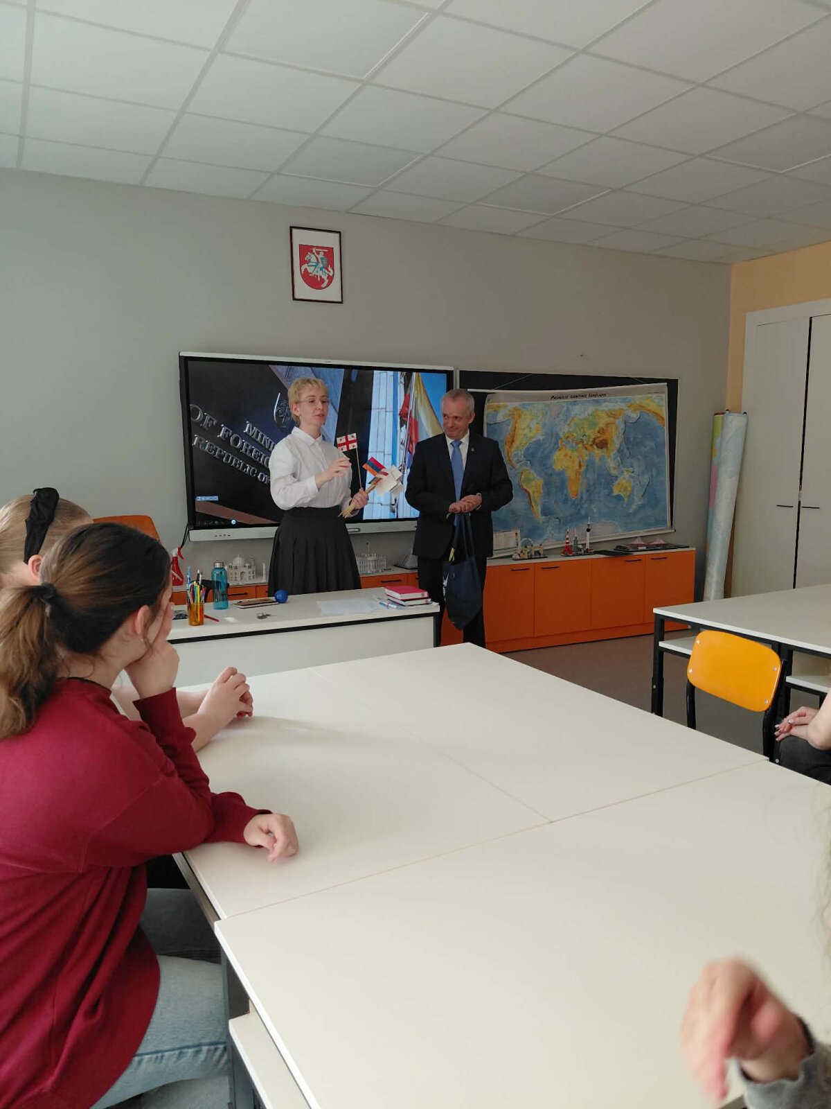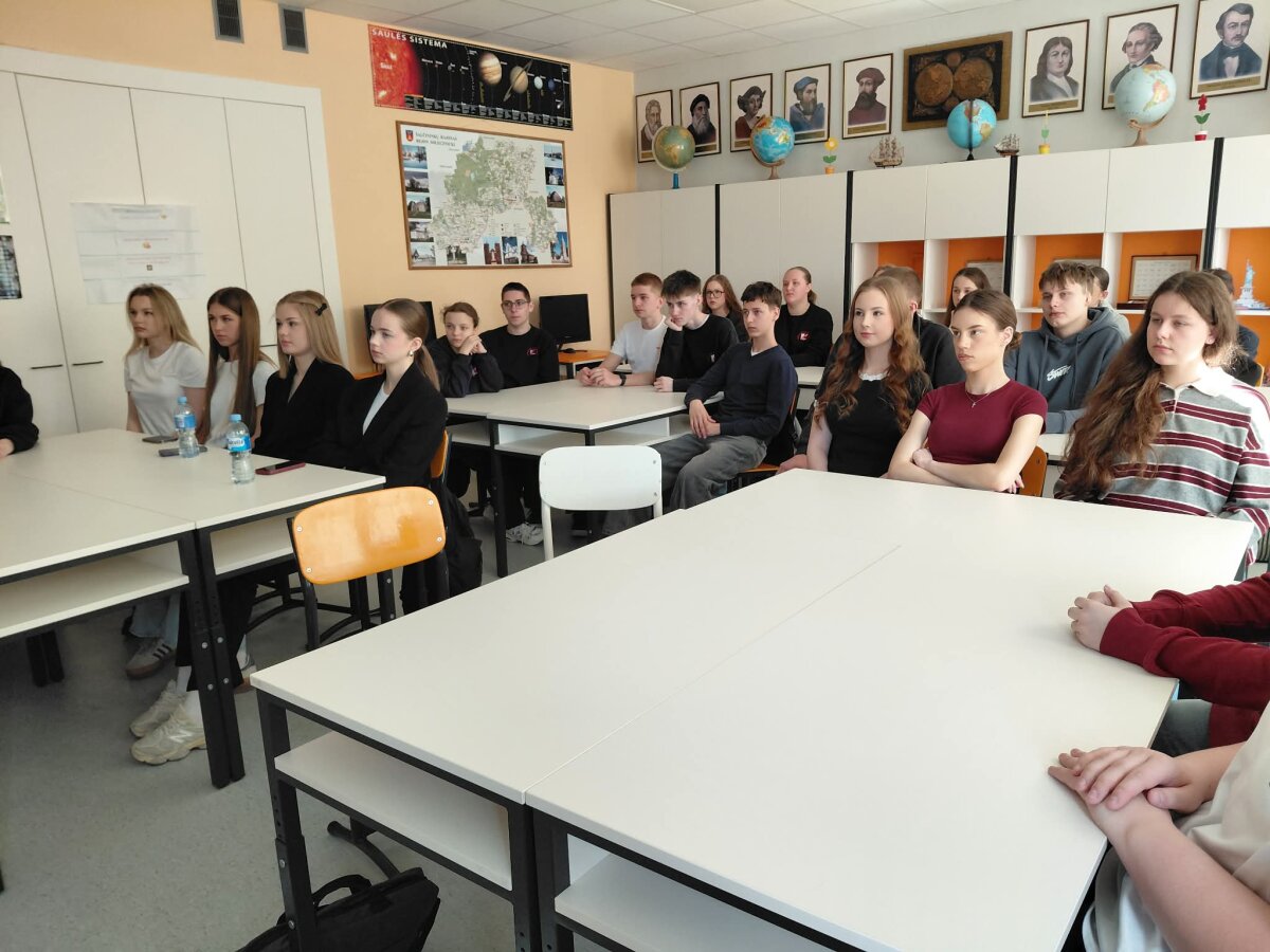 Balandžio 15 dieną mūsų gimnazijoje vyko netradicinė geografijos pamoka „Atgal į mokyklą“, kurioje dalyvavo II ir III gimnazijos klasių mokiniai. Pamokoje svečiavosi Lietuvos Respublikos užsienio reikalų ministerijos atstovai. Su mokiniais bendravo Mindaugas Kačerauskis, Užsienio reikalų ministerijos Rytų kaimynystės politikos departamento Rusijos skyriaus vedėjas, ir šio departamento atašė Diana Bezujevskytė. Susitikimo metu buvo aptarta Europos Sąjungos veikla, jos geografija ir Lietuvos vaidmuo ES kontekste.