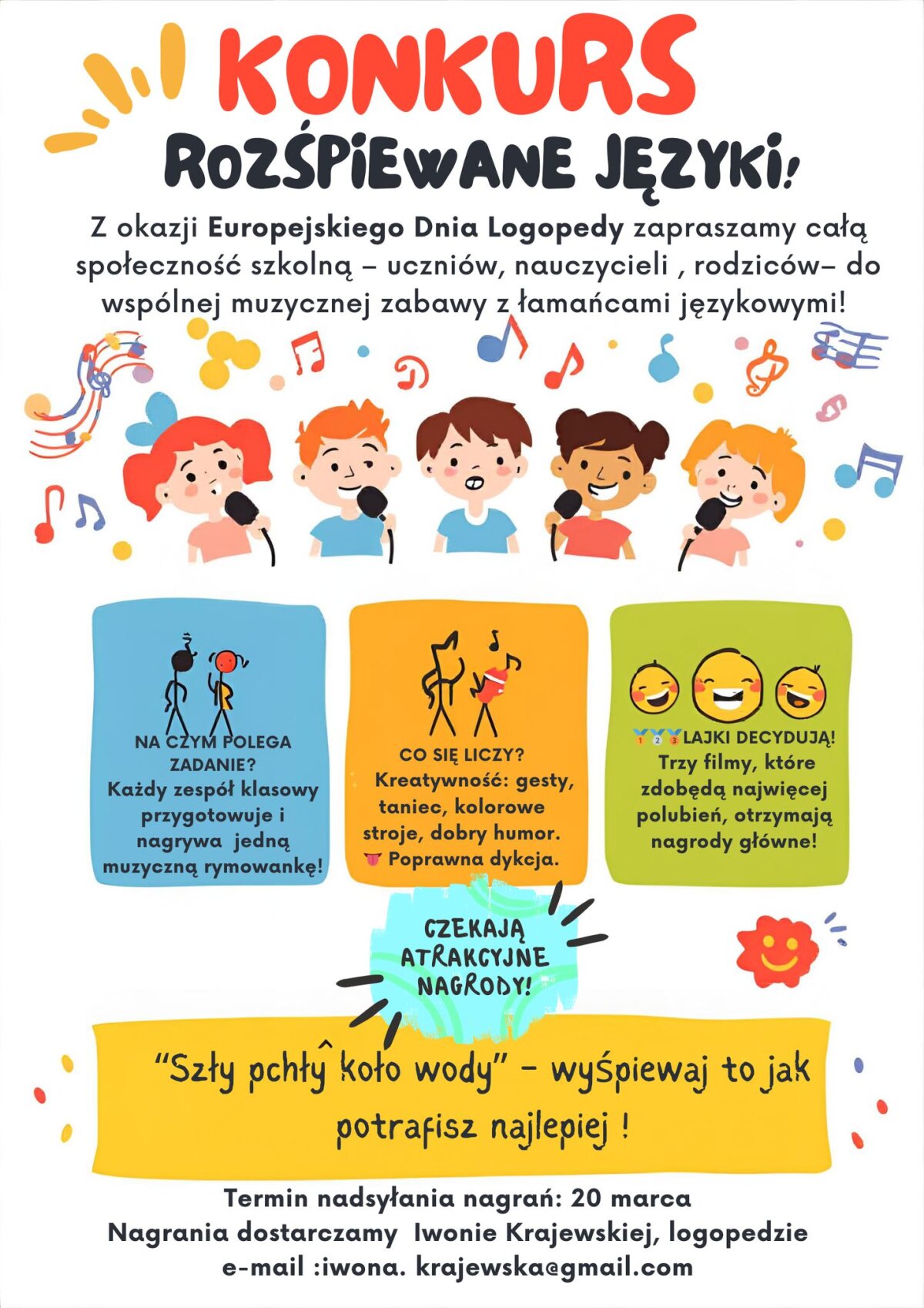 Zapraszamy klasy, solistów, grupy przyjaciół, a nawet całe rodziny do wykonania jednej krótkiej rymowanki (do wybranej melodii), której tekst opiera się na łamańcu językowym. Gotowe podkłady muzyczne do łamańców są do odebrania u logopedy – wystarczy zapytać!