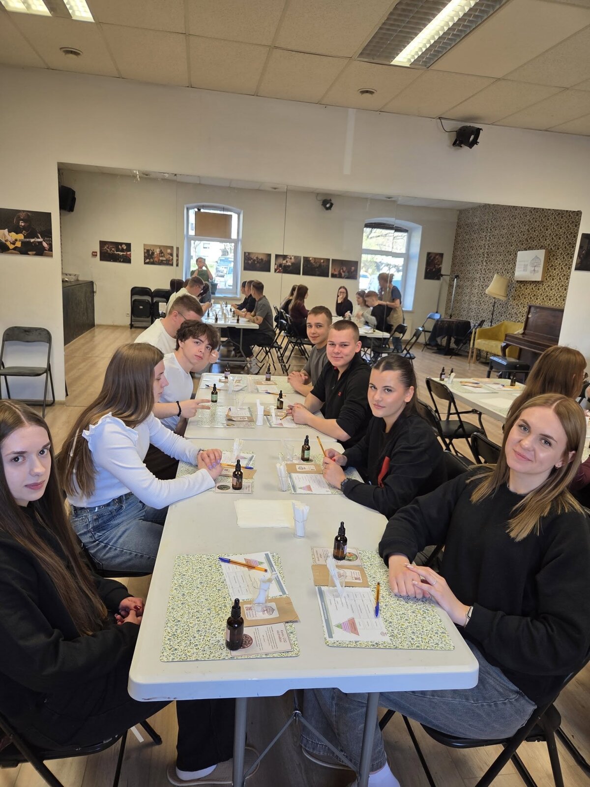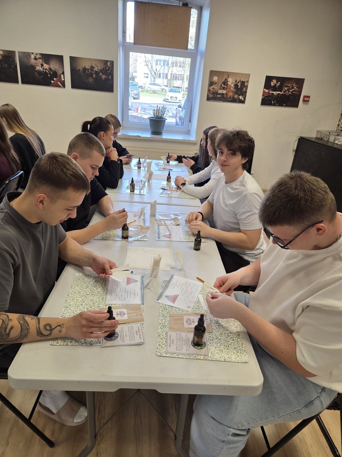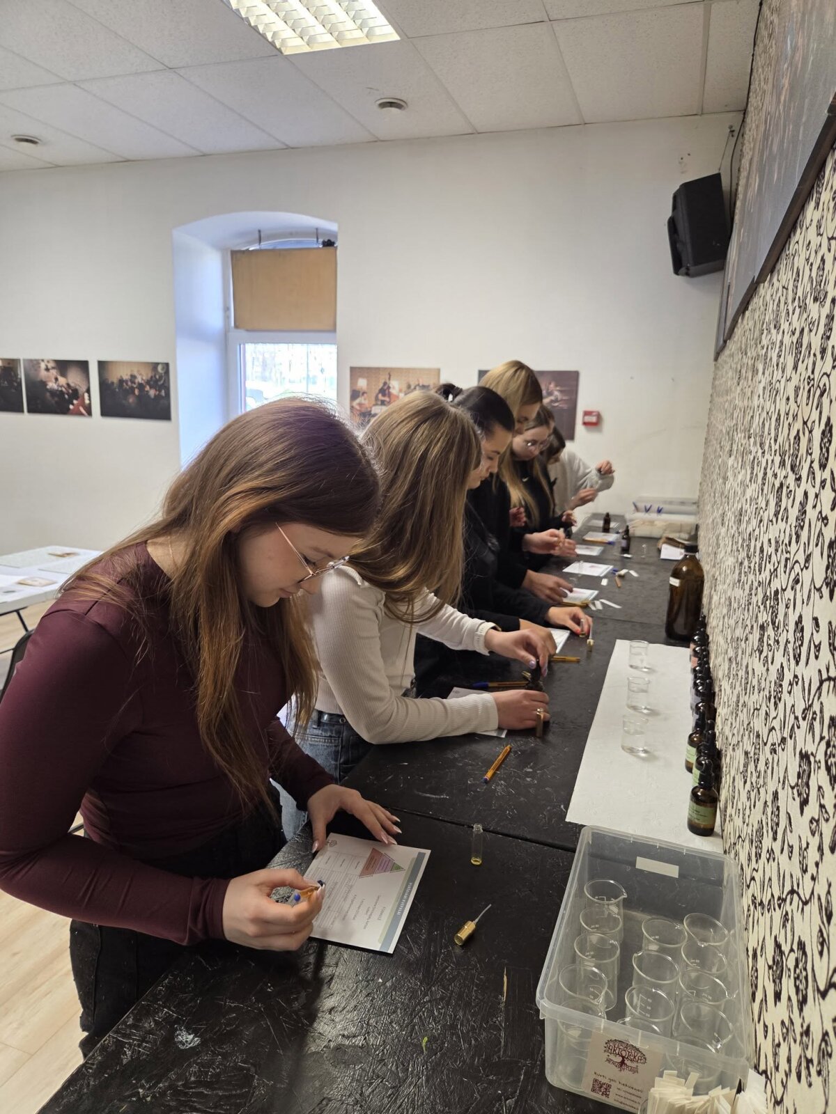 Uczestnicy wycieczki udali się do organizacji „ARTOTEKA”, gdzie wzięli udział w warsztatach tworzenia perfum. Podczas zajęć każdy miał okazję spróbować swoich sił w roli perfumiarza, wsłuchać się w swoje emocje i nastrój, poznać różne aromaty oraz stworzyć własne, unikalne perfumy w sprayu. Wybrane przez nas perfumy mogą wiele powiedzieć o naszym charakterze, nastroju, statusie społecznym, poglądach i zainteresowaniach. Są one jak nasz podpis, który może się nieustannie zmieniać w zależności od otoczenia, wydarzeń czy naszego stanu wewnętrznego. Każdy uczestnik stworzył 10 ml jedynych w swoim rodzaju, naturalnych perfum.